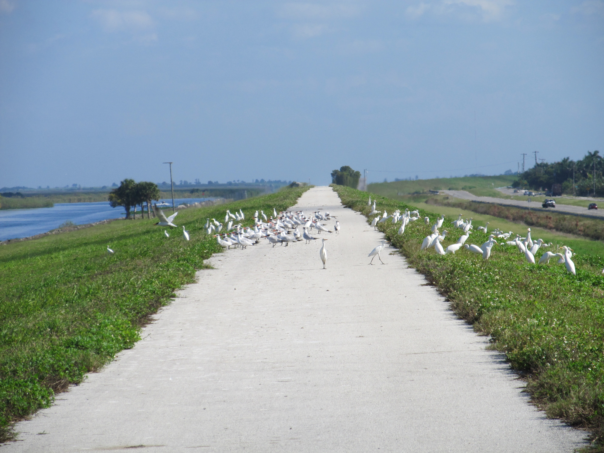 The best thing about riding atop the 34-foot tall levee was the view. Lake Okeechobee lay below us, and in some areas there was water on the other side of the dike. Both bodies of water provide great habitat for birds and other animals. Sometimes the huge birds (various wading birds and vultures) swooped by, spreading their broad wings at eye level. The view opposite the lake was filled with lots of sugar cane fields and semi busy route 27. We had a number of truckers honking and waving at us today, which reminded us of our touring days! We saw no other hiker, cyclist, or walker on the trail today, which made us want to scratch our heads.
